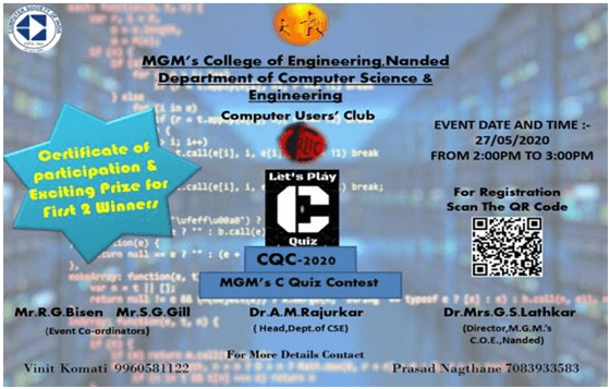 On 27th May, 2020 Computer Society of India Student’s Branch organized “C-Quiz Contest” under the guidance of Dr. Mrs. Geeta S. Lathkar, Director, M.G.M.’s C.O.E., Nanded, Dr. Archana Rajurkar, Head of CSE Department & President of CUC, Mr. R. G. Bisen, CSI Co-ordinator and Mr. S. G. Gill, CUC Event Co-ordinator.
