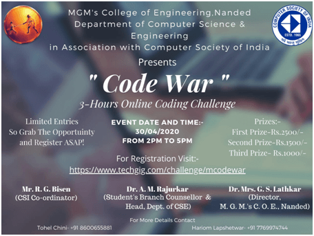 During the lockdown period of COVID-19 pandemic, the CSI Student's Council arranged many online events for students. One of those events was the “Code War - A 3-hours Coding Challenge”. The event was held on 30th April 2020 and it was the first National Level Coding Competition of M.G.M.'s College of Engineering, Nanded. 572 students from various institutes across India like IIT, NIT, IIIT participated for this event.