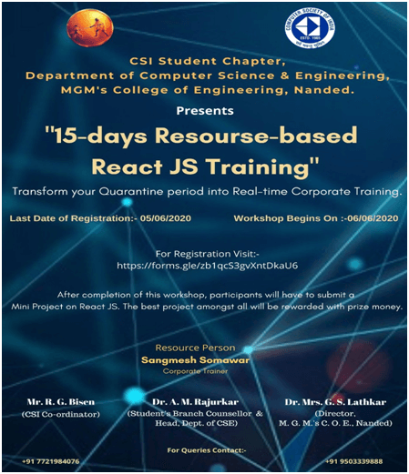 A “15 days Resource-based React JS Online Training programme” was organized by CSI Student’s Branch of Department of CSE from 6th June 2020 to 20th June 2020. Mr. Sangamesh Somawar, Alumni of M.G.M.’s College of Engineering, Nanded and a Corporate Trainer was a resource person for this training programme. Total registration for the event was 130 students from both CSE and IT department.