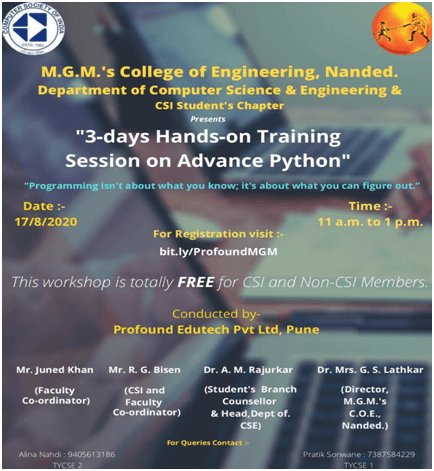 After completing 3 successful events during lockdown period, Department of CSE and CSI Student’s Council organized “3-days Hands-on Training Session on Advance Python” from 17th August to 19th August 2020. The main motto of this workshop was to utilize this COVID-19 pandemic time for exploring advance concepts of Python Programming and to robust students' competitive coding skills.