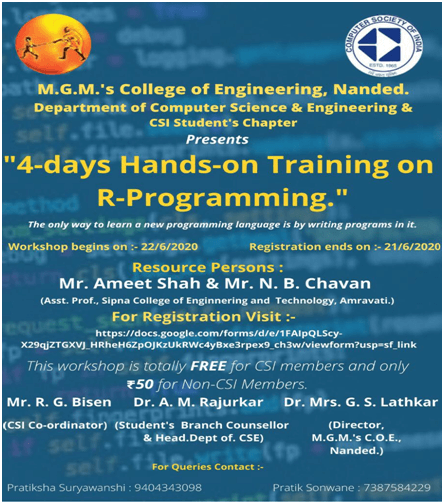 A “4-days Hands-on Training on R-Programming” was organized by CSI Students Chapter of Department of Computer Science & Engineering from 22nd June 2020 to 25th June 2020. The resource persons for the training were Mr. Ameet Shah and Mr. Nitin Chavan. They are working as Assistant Professor, Sipna College of Engineering and Technology, Amravati and had conducted many training sessions on R-programming. The main motto of this training was to enhance the skills of R Programming language among the students and total 126 students participated.