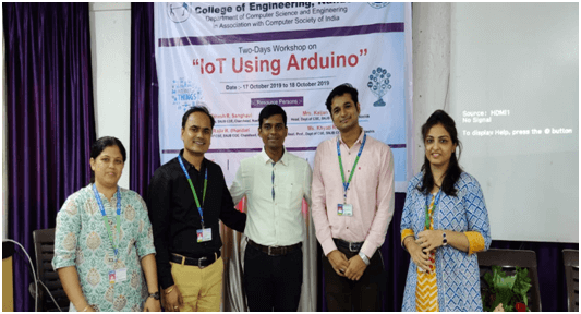 Department of Computer Science & Engineering in association with Computer Society of India had organized the 2-days workshop on “IOT using Arduino” on 17th and 18th October 2019. The workshop was inaugurated in the presence of Mr. Shirish L. Kotgire , Vice-Principal of MGM’s COE, Dr. A.M.Rajurkar, Student’s Branch Counsellor & HOD of CSE Dept. , Mr. Rahulsingh G. Bisen, Workshop Co-ordinator & Asst. Prof, Dept. of CSE, all faculties of CSE department and our resource persons.