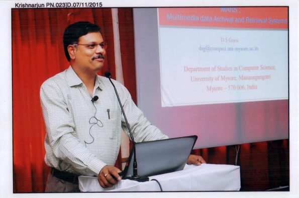 A highly energetic Expert Lecture we all experienced On Recent Research in Feature extraction and Pattern Recognition Dr. Mr. D. S. Guru, Professor and Nodal officer at University of Mysore, Mysore. Prof. D. S. Guru introduced us about the origin of feature extraction and pattern recognition. He explained the changes and increasing need of feature extraction and pattern recognition. Prof. Guru explained us that feature extraction has played a very important in the field of research and yet today the technologies such as machine learning use SVM methodology that is based on feature extraction only. On the other hand he said that pattern recognition focuses on the recognition of patterns and regularities in data. According to him terms such as pattern recognition, machine learning, data mining and knowledge discovery in databases (KDD) are hard to separate, as they largely overlap in their scope. Later in the session Mr. Guru explained us some latest researches done by using these two techniques.