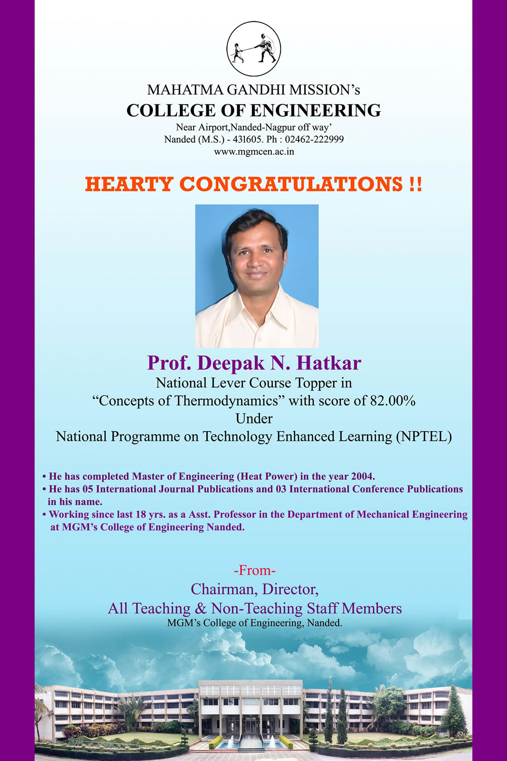 A Seminar on Engineering Mechanics by Dr. Amitabha Ghosh, was organized in M.G.M’s College of Engineering, Nanded on 23rd to 24th September 2015 .This Seminar was organized for All First Year students & for Faculty members related with Engg. Mechanics of MGM’s College of Engineering, Nanded.