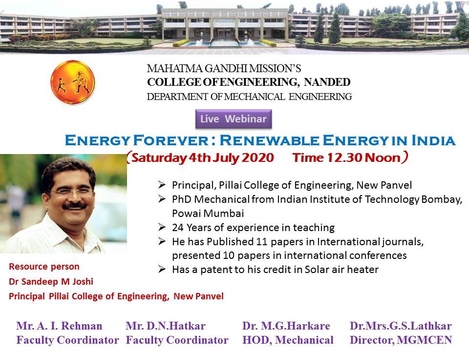 A webinar on Energy Forever:Renewable Energy India, by Dr. Sandeep Joshi, Principal, Pillai College of Engineering, New Panvel |