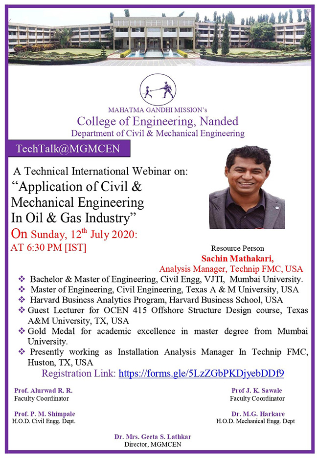 A webinar on Application of Civil and Mechanical Engineering in Oil & Gas Industry by Mr. Sachin Mathkari, Analysis Manager, Technip FMC, USA |