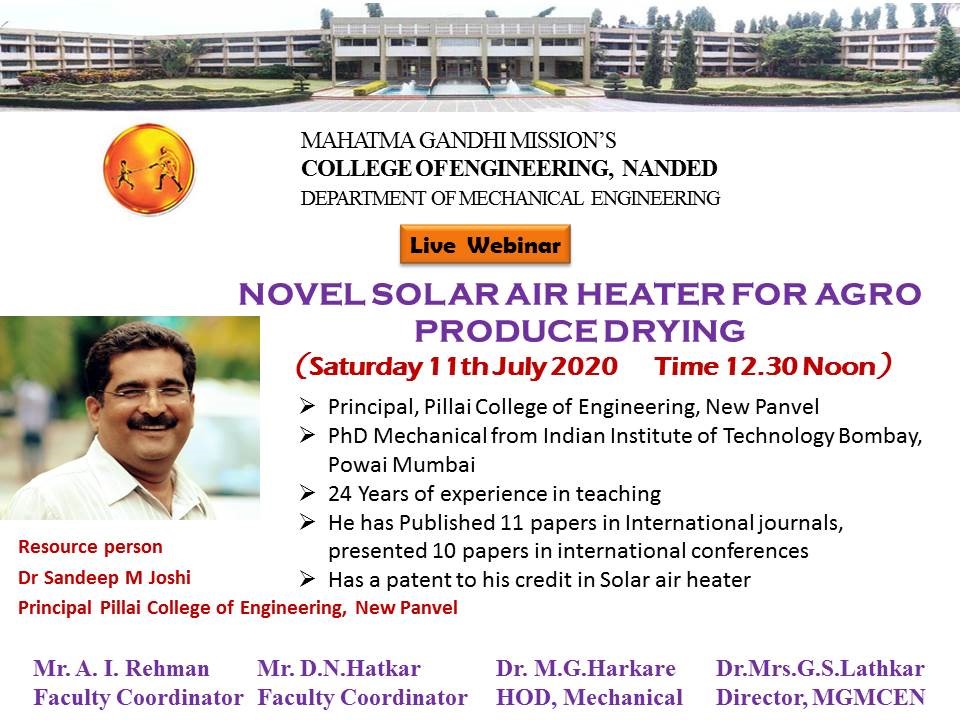 A webinar on Novel Solar Air Heater for Agro Produce Drying by Dr. Sandeep Joshi, Principal, Pillai College of Engineering, New Panvel |