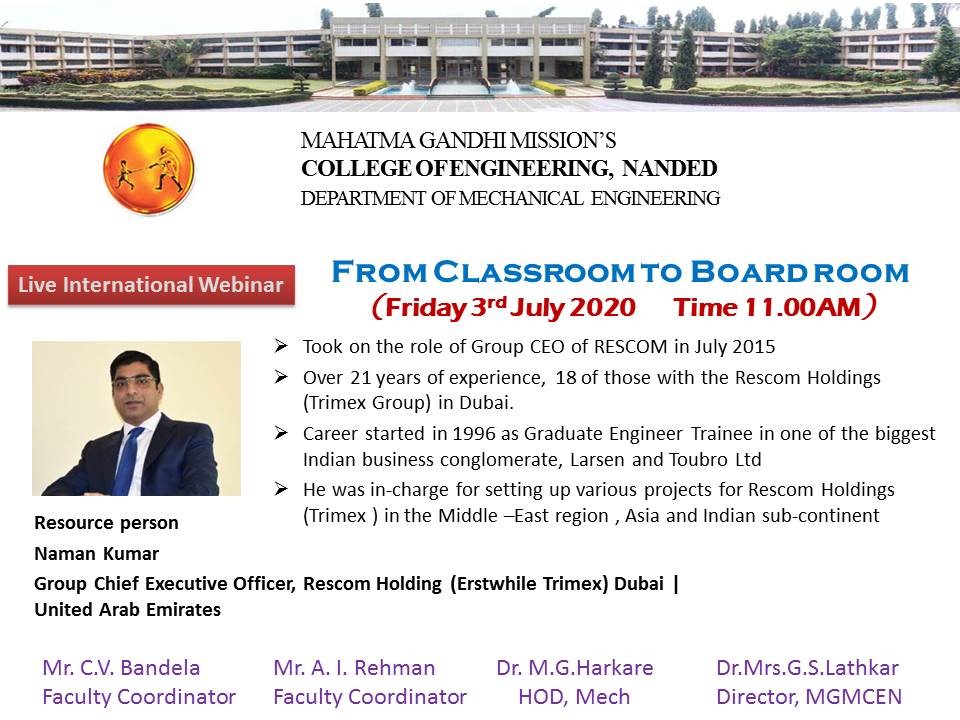 A webinar on from Class Room to Board Room, Mr. Naman Kumar, Group Chief Executive Officer, Rescon Holding(Erstwhile Trimex) Dubai, UAE |