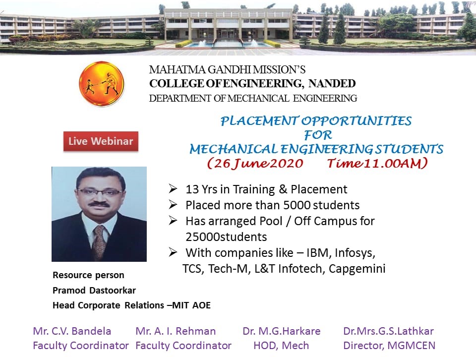 A Webinar on Placement opportunities for Mechanical Engineering students by Prof. Pramod Dastoorkar, head Coroporate Relations-MIT, AOE, Pune |